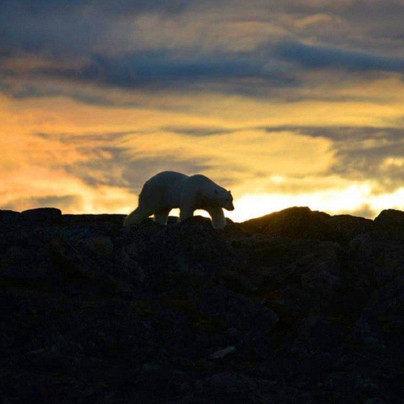 “Ieri e l’altro ieri sono stati due giornate davvero pazzesche! Durante la notte, un orso ha nuotato verso lo scafo mentre i cani dormivano nella cabina di guida, ad appena un metro di lontananza. Io ero assopito, non ho né visto né sentito nulla, quando improvvisamente ho udito un rumore di onde increspate e un brusio nella piattaforma! Mi sono alzato e ho visto l’orso lì vicino nella piattaforma che tornava indietro nuotando verso la riva. Ho deciso di dare un’occhiata più da vicino. Era giunto nell’entroterra e si notava come avesse stretta fra le zampe una carcassa. Allertato dai nostri passi ha deciso di andare verso un colle per guardarci meglio dall’alto. Poi però è tornato indietro. Ho sparato un colpo per spaventarlo, ma poche ore dopo è tornato nuovamente, determinato nel venire a farci un salutino… La domanda che ci si potrebbe fare è: che sia semplicemente una visita di cortesia o è tornato intenzionalmente, attratto dall’odore dei cani? Il giorno dopo, il nostro orso si trovava ancora nello stesso posto, indaffarato nel finire il suo pasto. Ancoriamo allora nell’altro lato della baia, mantenendo il motore acceso (in quanto non piace quel tipo di rumore all’orso), l’albero principale illuminato e le luci accese contro, con la tenda aperta nel retro, nel caso di un eventuale ritorno a bordo del nostro orsacchiotto, e tenendo tutti i cani sul ponte.”