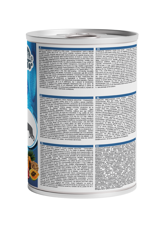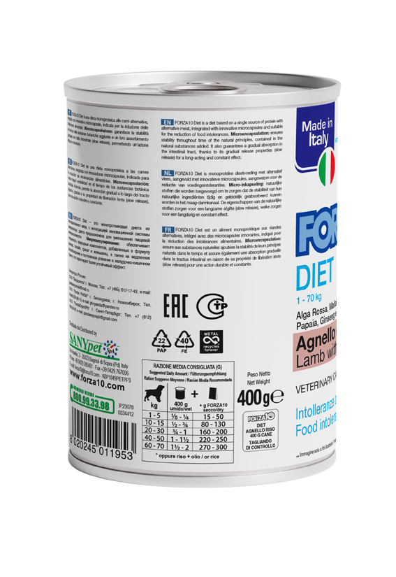 Composizione: carni e derivati 90% (agnello 100%), riso 4.1%, oli e grassi vegetali, sostanze minerali, Grifola frondosa 0.0135%, prodotti ottenuti dalla trasformazione di vegetali (Ananas spp. 0.013%), prodotti e sottoprodotti della trasformazione di frutta e verdura fresca (Carica papaya 0.012%), prodotti ottenuti dalla trasformazione di erbe (Aloe vera 0.0066%), alghe (Haematococcus pluvialis (astaxantina 0.0025%)).