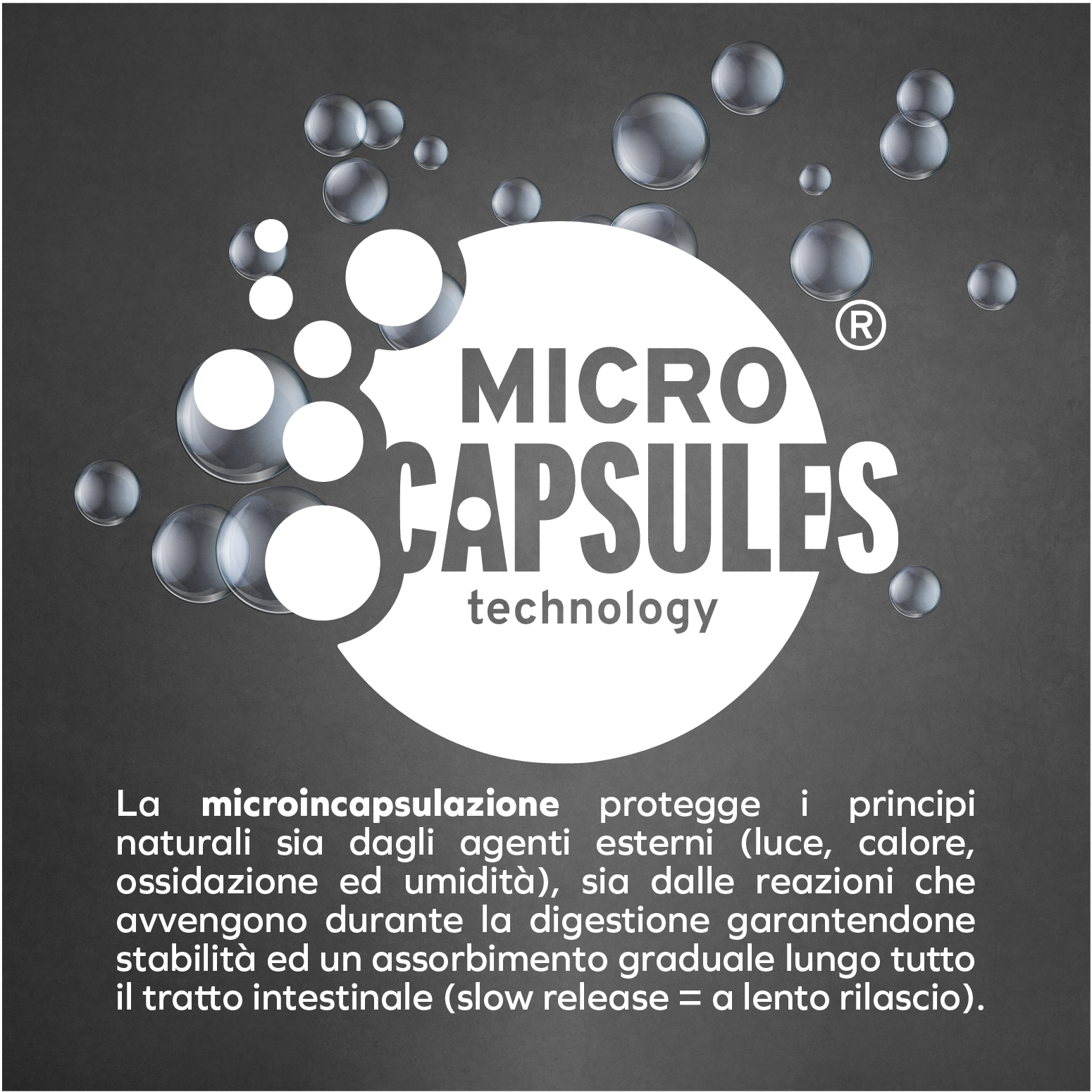 MICROCAPSULES TECHNOLOGY: La microincapsulazione protegge i principi naturali sia dagli agenti esterni (luce, calore, ossidazione ed umidità), sia dalle reazioni che avvengono durante la digestione garantendone stabilità ed un assorbimento graduale lungo tutto il tratto intestinale (slow release = a lento rilascio).