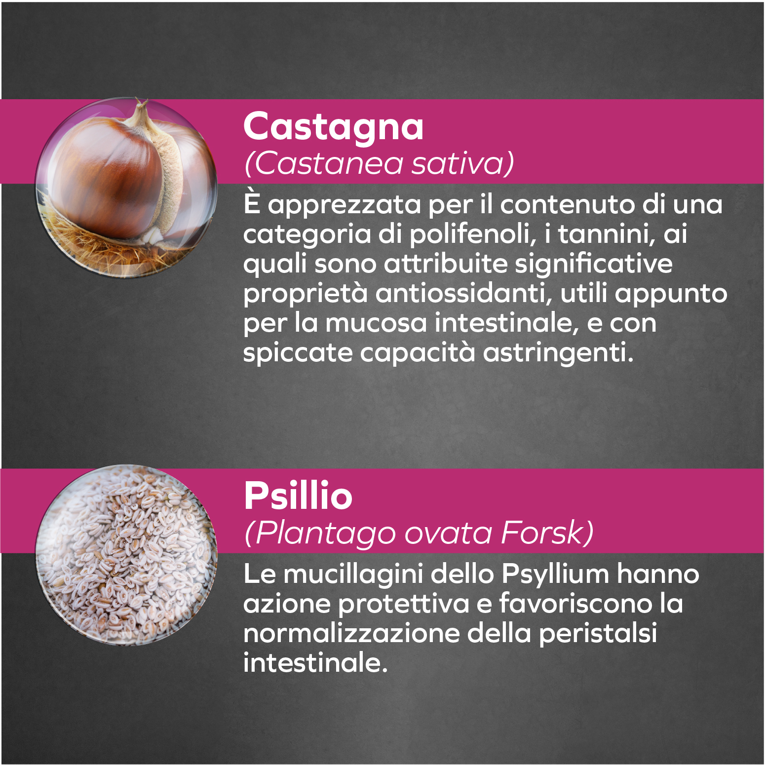 Castanea sativa: è apprezzata per il contenuto di una categoria di polifenoli, i tannini, ai quali sono attribuite significative proprietà antiossidanti, utili appunto per la mucosa intestinale, e con spiccate capacità astringenti.