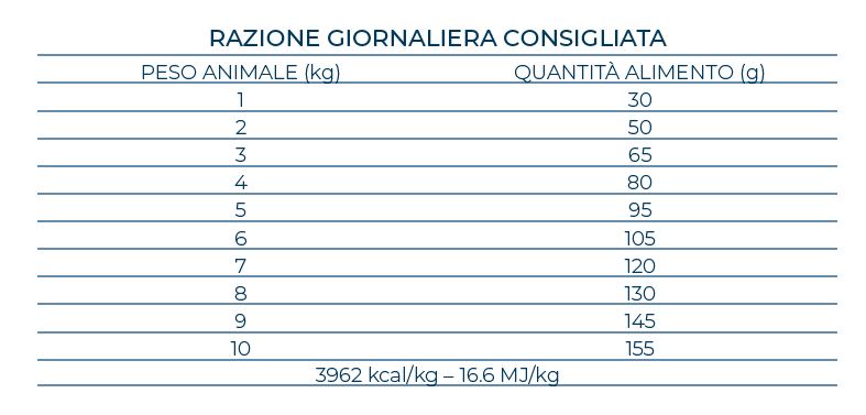 Particolare fine nutrizionale: a) supporto alla funzione dermica in caso di dermatosi ed eccessiva perdita di peli; b) per la riduzione di intolleranze a ingredienti e sostanze nutritive.