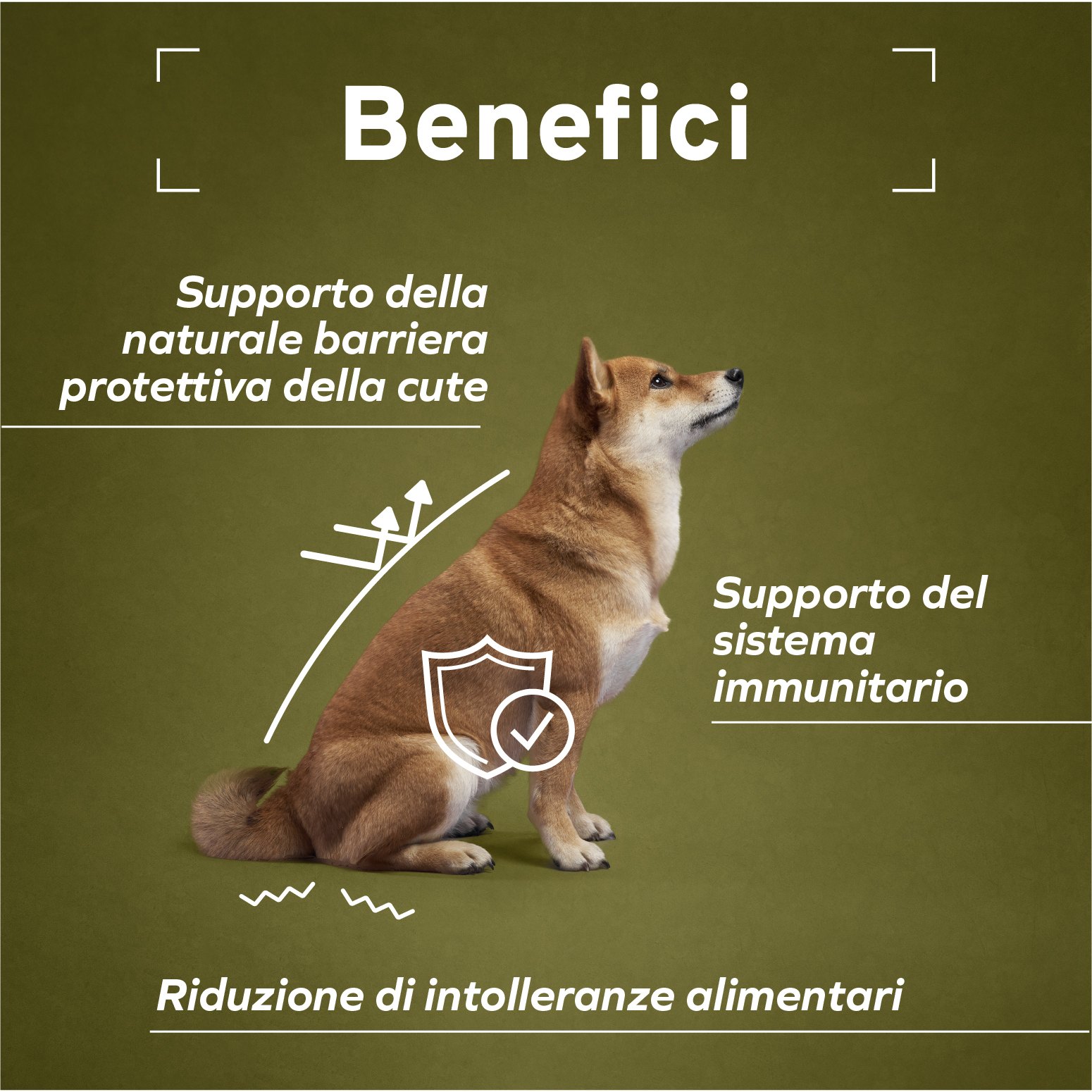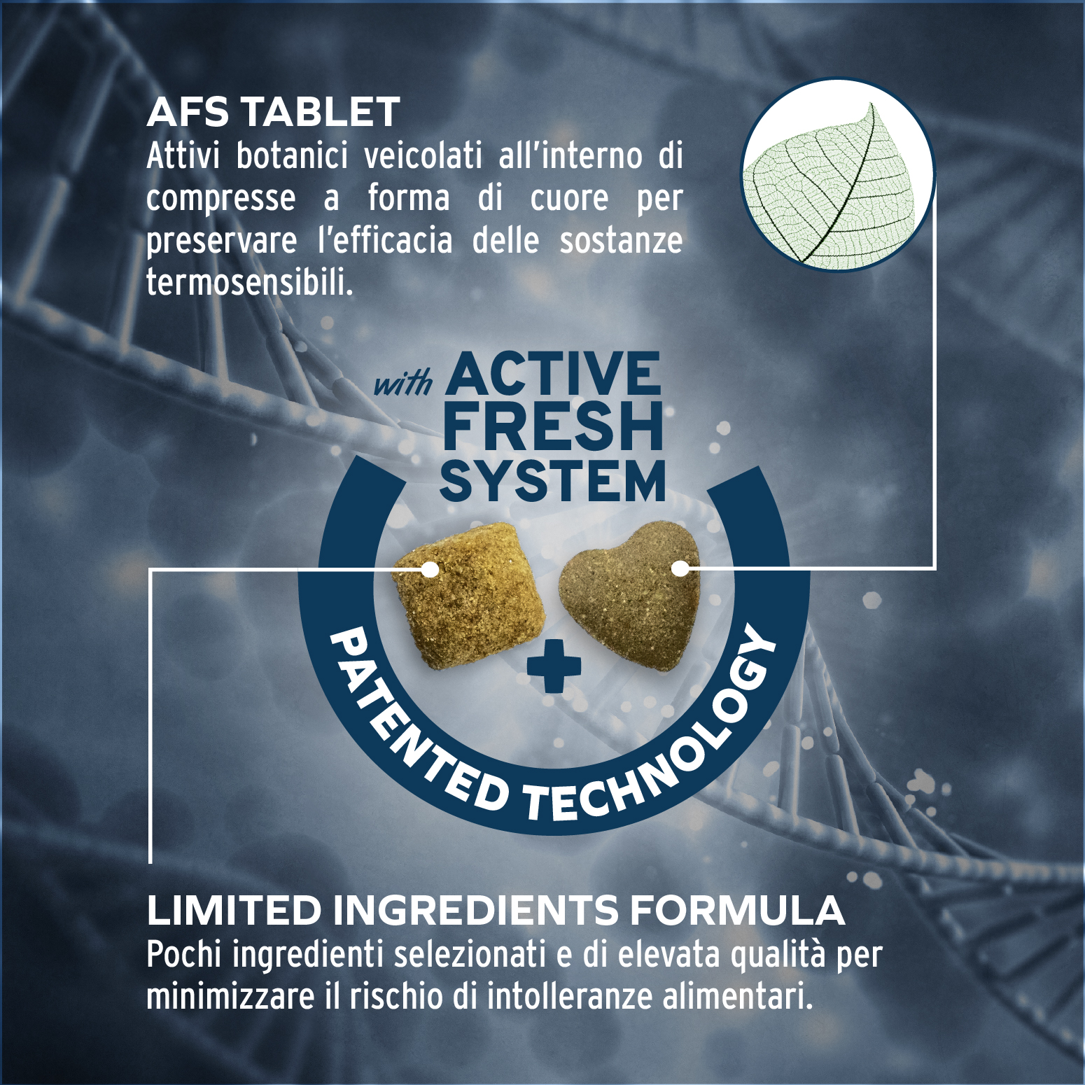 Monoprotein: formulato con unica fonte alternativa di proteine animali: proteina di pesce ad elevato valore biologico e con alta biodisponibilità. Limited ingredients formula: pochi ingredienti selezionati e di elevata qualità per minimizzare il rischio di intolleranze alimentari.