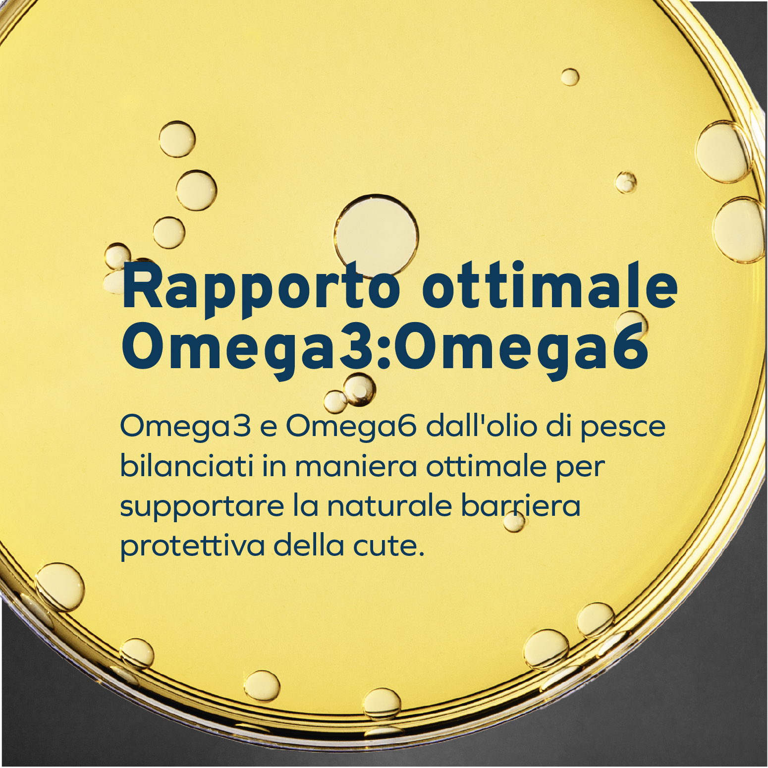 Rapporto ottimale Omega3:Omega6: Omega3 e Omega6 dall’olio di pesce bilanciati in maniera ottimale per supportare la naturale barriera protettiva della cute.