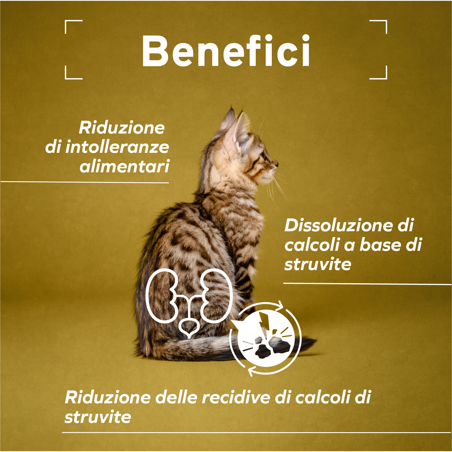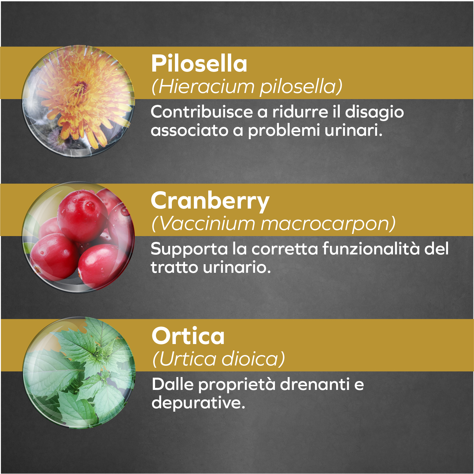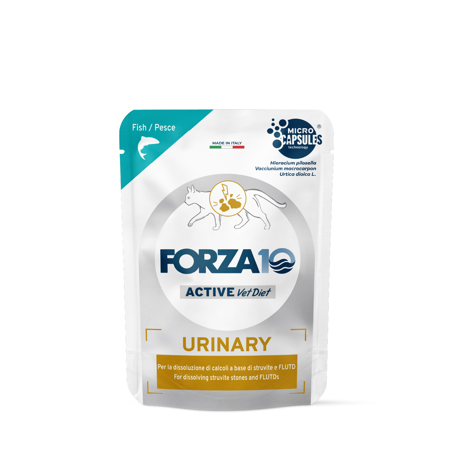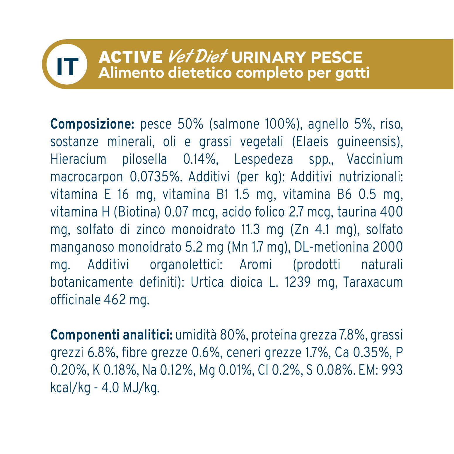 Additivi (per kg): Additivi nutrizionali: vitamina E 16 mg, vitamina B1 1.5 mg, vitamina B6 0.5 mg, vitamina H (Biotina) 0.07 mcg, acido folico 2.7 mcg, taurina 400 mg, solfato di zinco monoidrato 11.3 mg (Zn 4.1 mg), solfato manganoso monoidrato 5.2 mg (Mn 1.7 mg), DL-metionina 2000 mg. Additivi organolettici: Aromi (prodotti naturali botanicamente definiti): Urtica dioica L. 1239 mg, Taraxacum officinale 462 mg.